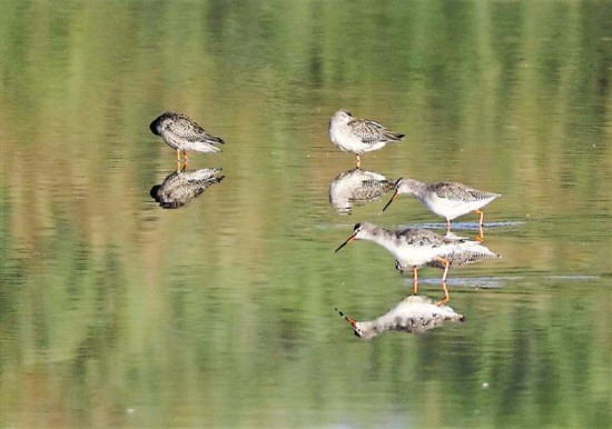 銀川濕地中,鶴鷸三三兩兩在水中覓食。