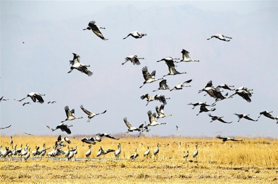 石嘴山市惠農區萬畝稻田收割后,總會迎來第一批客人——國家二級保護動物灰鶴。