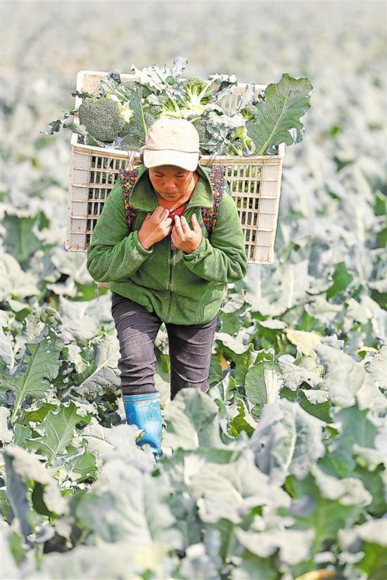 工人背著收獲滿滿的菜筐,穿梭在菜地間。