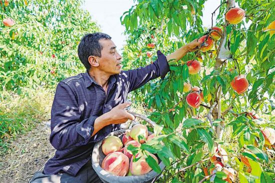 銀川市金鳳區良田鎮園子村設施溫棚園區,村民在采摘“國慶紅”蜜桃。