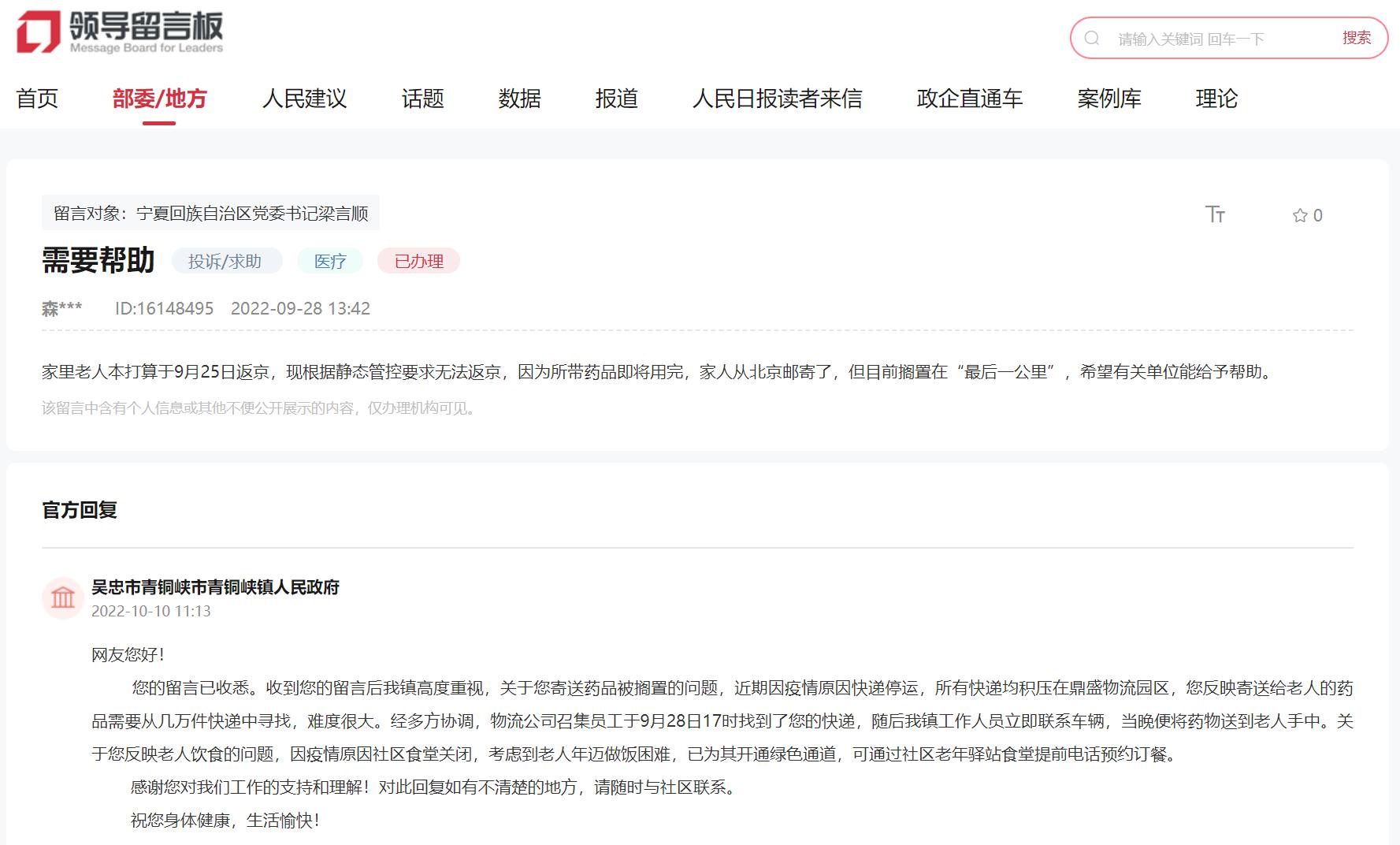 針對此留言,吳忠市青銅峽市青銅峽鎮人民政府回復稱,收到您的留言后我鎮高度重視,關于您寄送藥品被擱置的問題,近期因疫情原因快遞停運,所有快遞均積壓在鼎盛物流園區,您反映寄送給老人的藥品需要從幾萬件快遞中尋找,難度很大。經多方協調,物流公司召集員工于9月28日17時找到了您的快遞,隨后我鎮工作人員立即聯系車輛,當晚便將藥物送到老人手中。關于您反映老人飲食的問題,因疫情原因社區食堂關閉,考慮到老人年邁做飯困難,已為其開通綠色通道,可通過社區老年驛站食堂提前電話預約訂餐。