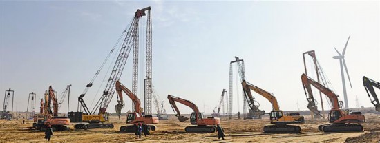 2014年11月4日,在靈武市白土崗鄉的半荒漠地帶,寧東—浙江特高壓直流輸電工程靈州換流站施工現場一派繁忙的景象。 (資料圖片)