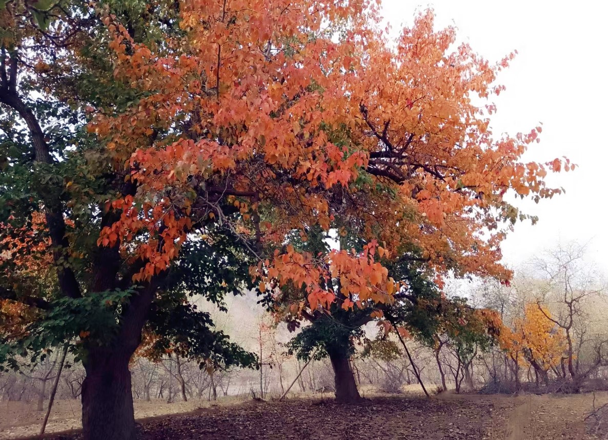11月10日,中衛市沙坡頭區迎水橋鎮北長灘村古梨樹園內,紅葉紛飛,層林盡染,吸引了不少游客?!拔覀冃r候,這些樹就有這么粗了?!北遍L灘村76歲的老人劉文學指著高大的梨樹對記者說。