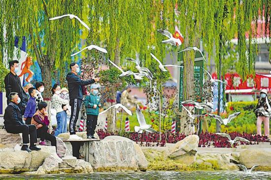 每逢遷徙季,紅嘴鷗千里赴約,在銀川各濕地湖泊停留。這幅人與自然和諧相處的畫面,已經成為城市“相冊”的經典畫面。