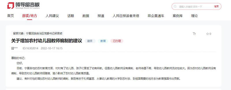 該網友表示,目前寧夏各地農村建起了幼兒園,孩子們享受到了幼有所教。但因農村幼兒園教師沒有編制,導致農村幼兒園教師招聘難,間接影響了農村幼兒園教育質量。希望能增加編制,提高教師待遇,鼓勵有志于扎根基層,從事幼兒教育的大學生到農村去,到祖國需要的地方去為教育強國作出貢獻。