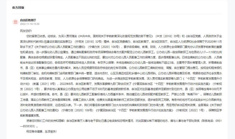 收到網友留言后,寧夏回族自治區教育廳公開作出回復?;貜头Q,為深入貫徹落實中央和寧夏相關文件精神,自治區黨委編辦、自治區教育廳、自治區財政廳、自治區人力資源和社會保障廳于2020年11月聯合下發了《關于做好公辦幼兒園人員配備工作的通知》(寧編辦發〔2020〕106號),要求各級編制、教育、財政、人力資源社會保障部門要充分認識發展學前教育的重要性和緊迫性,進一步強化幼兒園公益屬性,通過編制配備和政府專項保障相結合等方式配齊配足公辦幼兒園教職工。