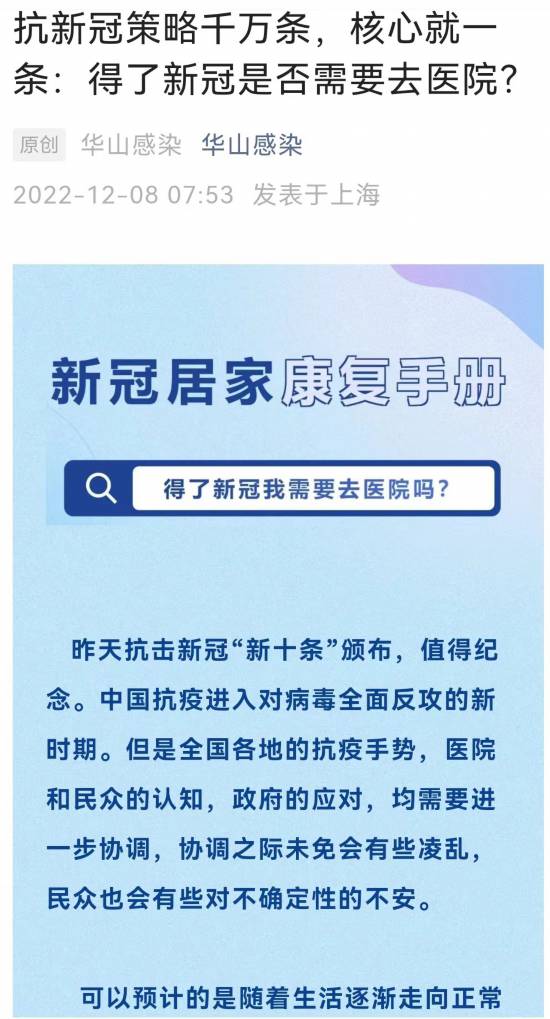 積極抗疫宣教,是政府部門對于公立醫療機構的明確要求,也是醫務人員的高度共識:疫情達峰的“窗口期”很短,必須盡快提升公眾自我健康管理能力,消除恐慌、焦慮,只有大部分人安心居家康復,盡量不跑醫院,才能將有限的醫療資源留給最需要的人。