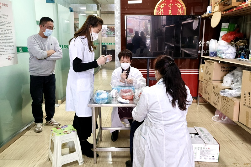 藥店員工將布洛芬分發給需要的市民并講解使用方法。石嘴山市委宣傳部供圖