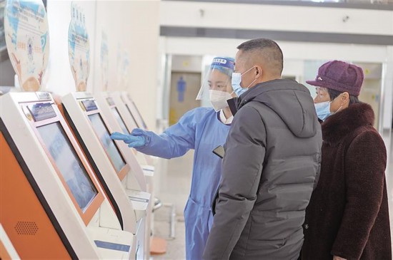 銀川河東國際機場出發大廳,機場工作人員正幫助旅客進行自助值機。記者 張唯 攝
