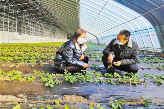 工人在日光溫棚內查看安裝電暖爐后的草莓長勢。
