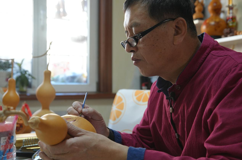 葫蘆諧音“福祿”?!案5摗笔侨藗冏非竺篮蒙畹囊粋€向往,希望日子幸福安康,福祿雙全?!鞍牙L畫、烙畫藝術巧妙構思于葫蘆之上,在增加葫蘆藝術價值的同時,更使這些藝術葫蘆古樸自然,別具魅力?!标愊孳娬f。