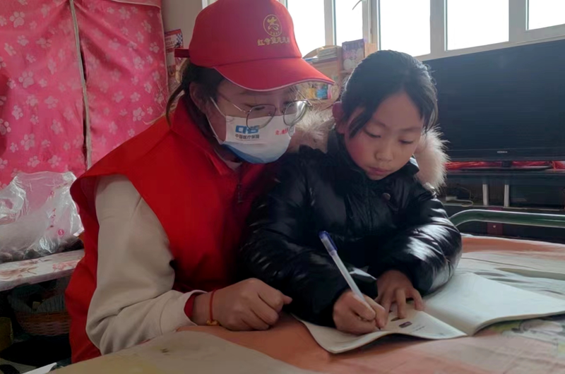 紅寺堡區柳泉鄉紅塔村的大學生志愿者輔導孩子寫作業。王彩玲攝