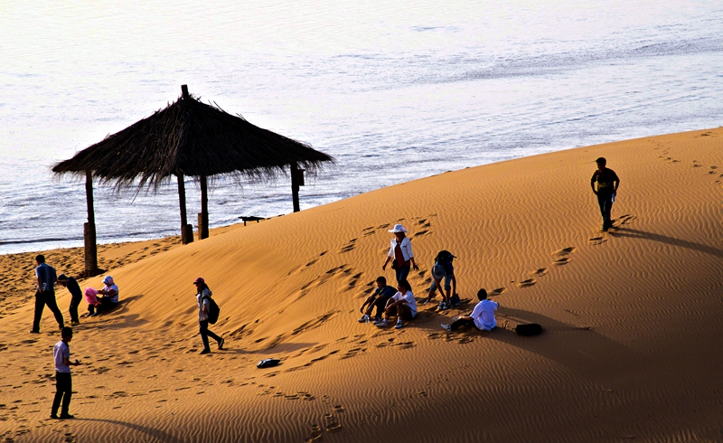 第一站:治沙推廣實驗區。踏入治沙推廣實驗區,可以看到黃沙古渡近年來始終堅持以保護生態優先,通過生物治沙所取得的成果。這里是沙生動植物的天堂,生態保護區內有沙棗樹、蟲實、沙蒿等植物。如果有幸您還能看見斑翅山鶉、雉雞、野兔、草原沙蜥、白條錦蛇等野生動物。因沙棗樹開花時清香而不膩,生命力極其頑強,每年的5月下旬,景區通過舉辦“沙棗花香節”,讓更多的游客來到這里,賞花、聞香,在清香的環境中游玩。生態保護區內最具代表性的植物要屬花棒,每年的七到十月份開花,形狀為粉色小花朵,是景區內一道靚麗的風景。