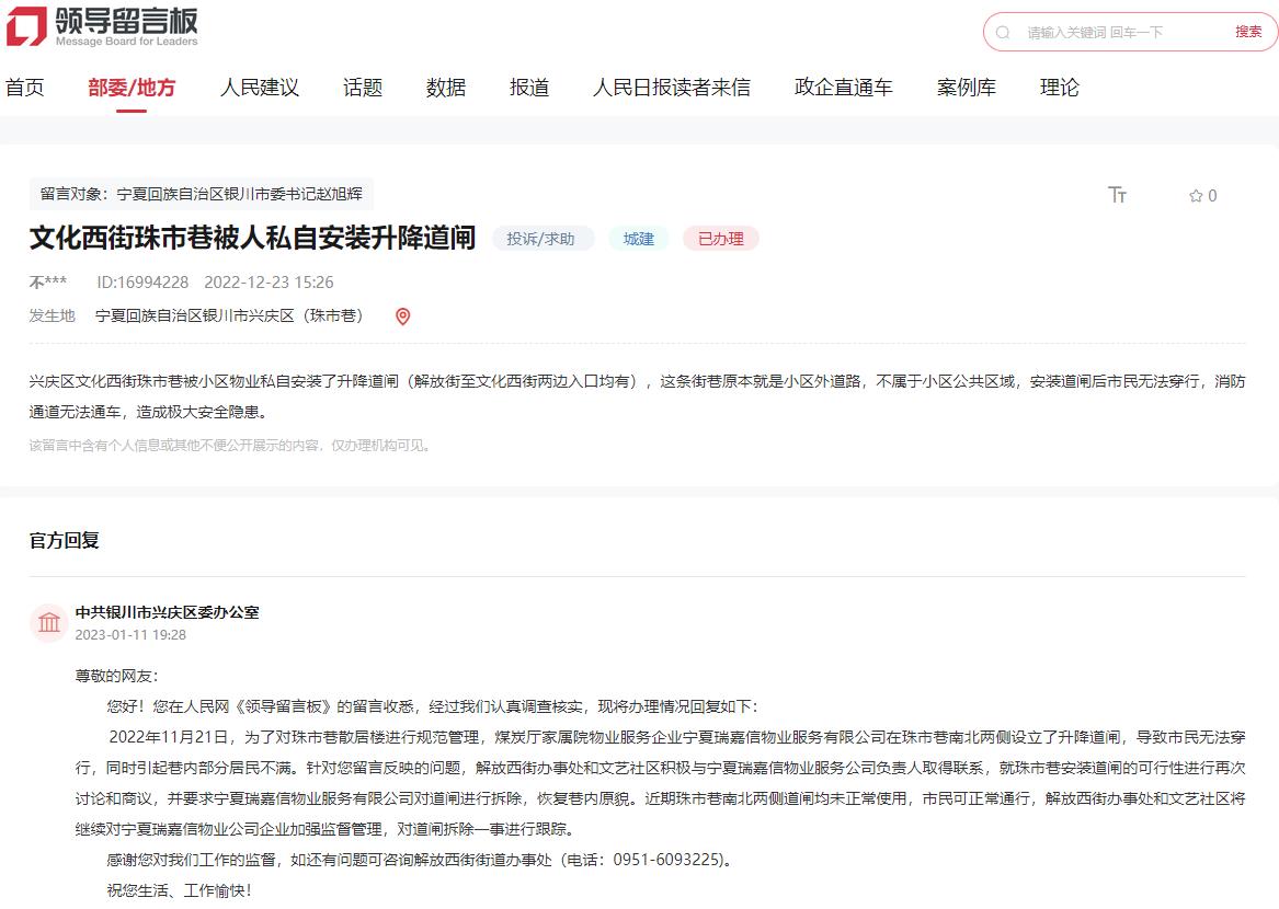 針對該留言,銀川市興慶區委辦公室回復稱,經過調查核實,2022年11月21日,為了對珠市巷散居樓進行規范管理,煤炭廳家屬院物業服務企業寧夏瑞嘉信物業服務有限公司在珠市巷南北兩側設立了升降道閘,導致市民無法穿行,同時引起巷內部分居民不滿。為此,解放西街辦事處和文藝社區積極與寧夏瑞嘉信物業服務公司負責人,就珠市巷安裝道閘的可行性進行再次討論和商議,要求寧夏瑞嘉信物業服務有限公司對道閘進行拆除,恢復巷內原貌。