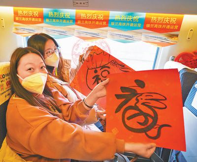 一大早,滿座的車廂里便歡聲陣陣。迎春的剪紙貼滿窗戶,旅客們神采奕奕地給親朋打電話報平安,輕松的語氣傳遞著喜悅。如今,蘭州和銀川之間的高鐵用時僅需2小時56分,較此前的普通列車節約近5小時30分——旅途變“短”了,心情當然變美了。