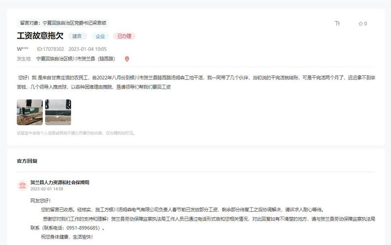 收到留言后,寧夏銀川市賀蘭縣人力資源和社會保障局作出公開回復?;貜头Q,經核實,施工方銀川湯姆森電氣有限公司負責人春節前已發放部分工資,剩余部分待復工之后協調解決,請訴求人耐心等待。