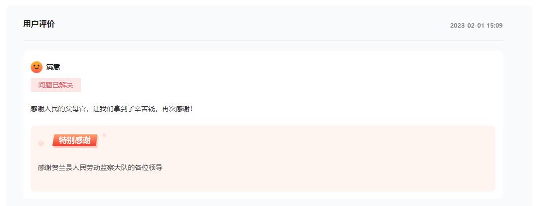 據了解,2023年1月20日,該網友與工友收到了部分工資,約12.6萬元?!笆S嗖糠?,對方答應節后解決?!本W友對留言板辦理結果表示滿意,“感謝人民的父母官,讓我們拿到了辛苦錢,再次感謝!”