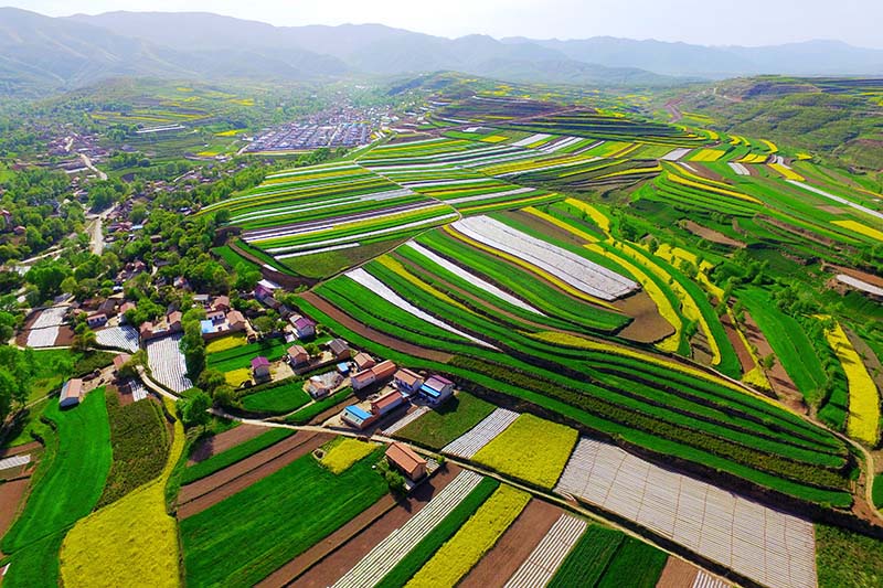 縱橫阡陌曲線盈,田疊千層詩畫情。層層梯田,如鏈似帶,從山腳一直盤繞到山頂,高低錯落,蔚為壯觀。沿著蜿蜒的小路,看梯田千丈沐炊煙,聽六盤山民俗花兒響徹田間,品當地鄉村振興、生態文明建設成果,切身感受固原梯田的獨特魅力。全國鄉村旅游重點村——西吉縣龍王壩村就坐落于固原層層梯田中,從龍王壩民宿向下望去,錯落有致的梯田將山坡裝點得五彩斑斕,別有韻味。