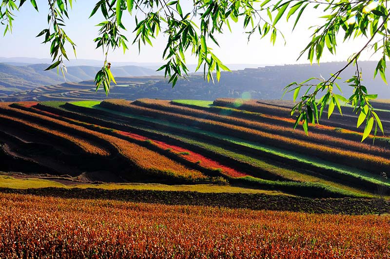 絕俏彩霞染碧空,萬頃梯田入畫中。固原梯田分布于寧夏南部六盤山區,始于上世紀60年代,是當地群眾堅持戰天斗地“坡改梯”、既種莊稼又種風景,“一任接著一任干,一張藍圖繪到底”,精心打造的一項規模宏大的綠色生態工程。美輪美奐的梯田鑲嵌在黃土高原的每一處褶皺上,條條田壟如鏈似帶,從山腳盤旋至山頂,層層疊疊,高低錯落,形成春賞山花、夏觀梯田、秋品紅葉、冬覽水墨的四季畫卷,被譽為最美的大地“指紋”“中國最美旱作梯田”,入選“中國美麗田園”10項梯田景觀之一。