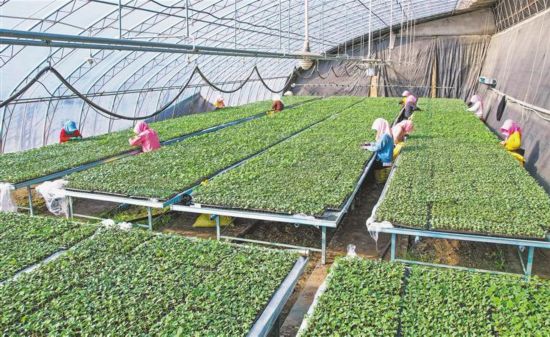 寧夏益民果蔬種植農民專業合作社苗棚內,村民正忙著選苗、間苗和拼盤等分級管護,為春耕備耕作準備。