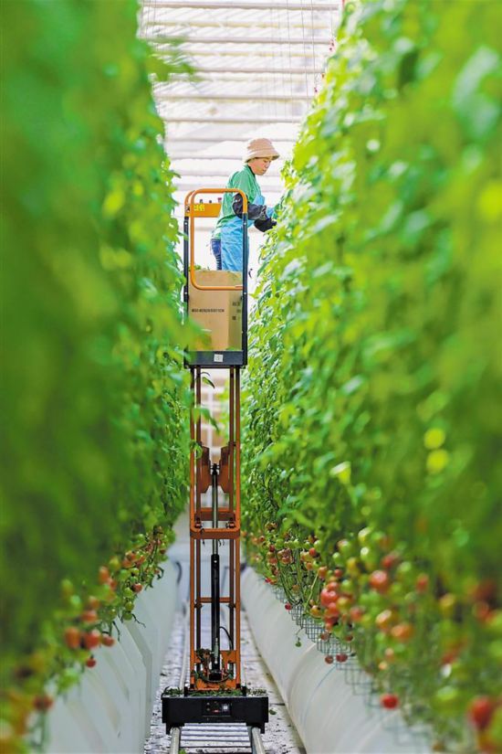 永寧縣閩寧鎮凱盛(銀川)現代智慧農業產業園,工人對番茄株蔓進行抹杈、盤頭。