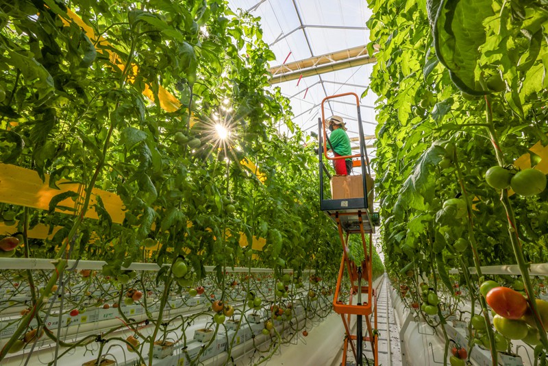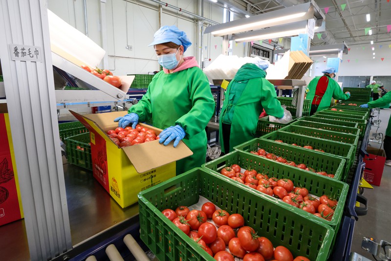 工人在智慧溫室內采摘桃太郎番茄。黨碩攝