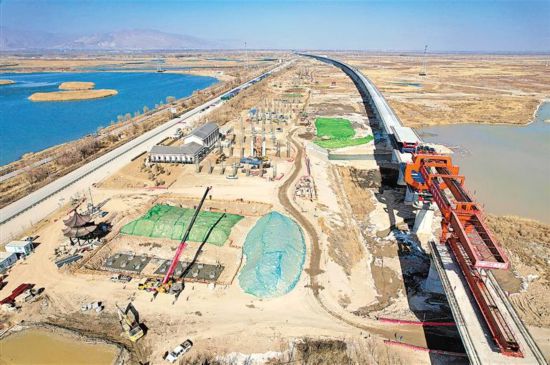 3月6日,包銀鐵路石嘴山特大橋正在加緊建設。該橋全長39公里,共采用預制箱梁602榀,預計7月中旬全部架設完成。