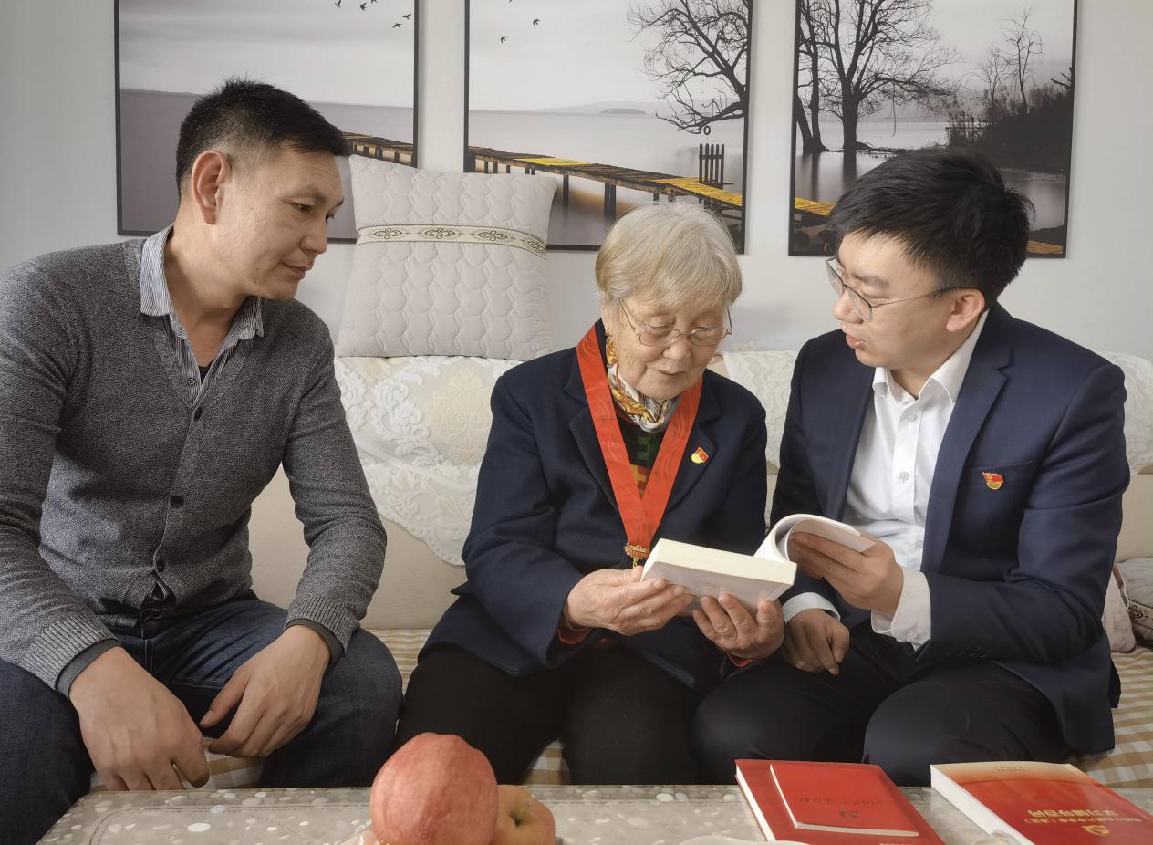 利通區古城鎮朝陽村黨支部書記張鵬為老黨員李淑珍開展“送學上門”。圖片由吳忠市新聞傳媒中心提供