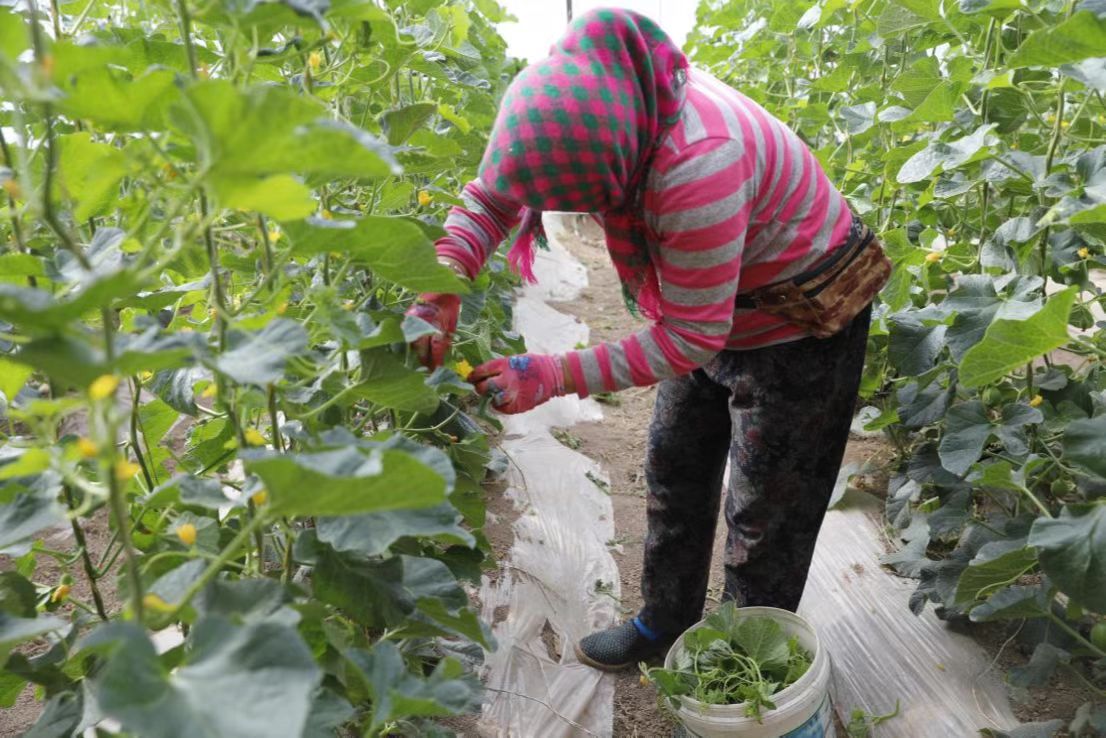 工人們在張亮村溫室大棚內打理瓜葉。人民網 李甜甜攝