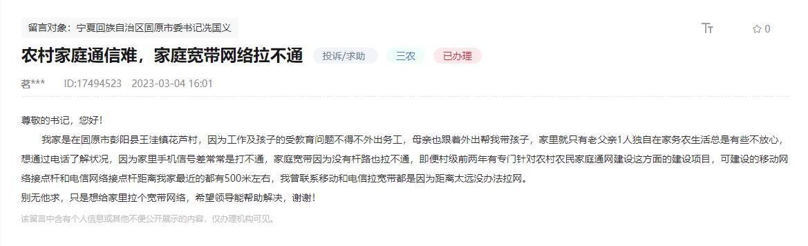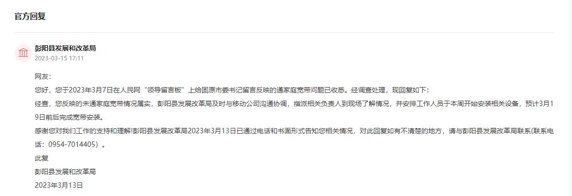 針對該留言,彭陽縣發展和改革局作出公開回復,經查,該網友所反映的未通家庭寬帶情況屬實,彭陽縣發展改革局及時與移動公司溝通協調,指派相關負責人到現場了解情況,并安排工作人員安裝相關設備,預計3月19日前后完成寬帶安裝。 ?