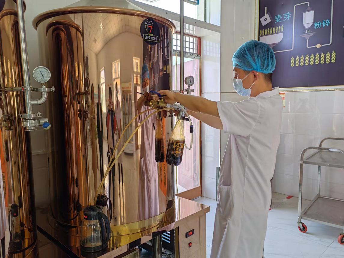 在沙坡頭區城北村黨支部領辦合作社啤酒精釀廠,釀酒設備不停地運轉,酒香四溢。