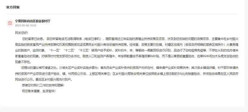 收到留言后,寧夏回族自治區農業農村廳作出公開回復?;貜头Q,“隨即查閱近三年實施的養殖業扶持政策及項目,涉及到您反映的問題的政策項目,主要集中在鄉村振興局實施的脫貧富民產業扶持政策和鞏固拓展脫貧攻堅成果同鄉村振興有效銜接扶持政策?!?/p>