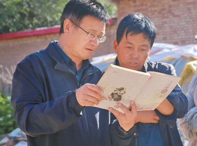 劉世友(左)和同事在查閱資料。隆德縣文物管理所提供