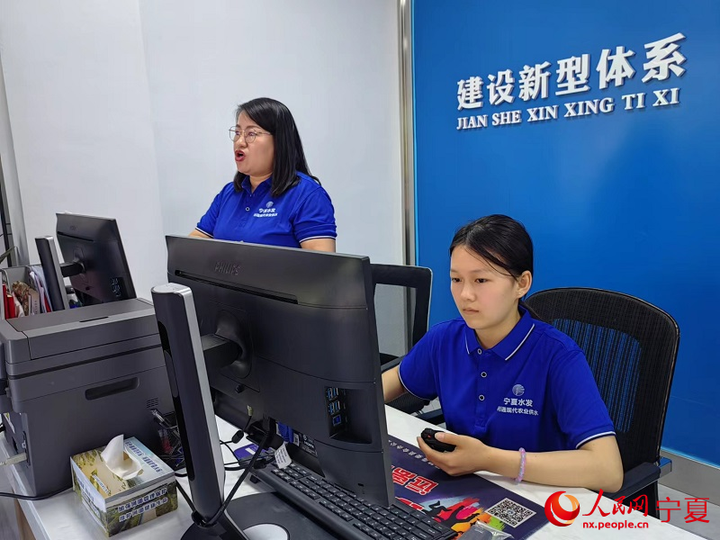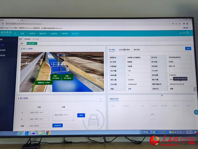 人民網銀川6月17日電(李甜甜)走進寧夏吳忠市利通區馬蓮渠鄉惠裕農業灌溉服務專業合作社,工作人員正用監測系統查看著當天灌溉區的實時情況。