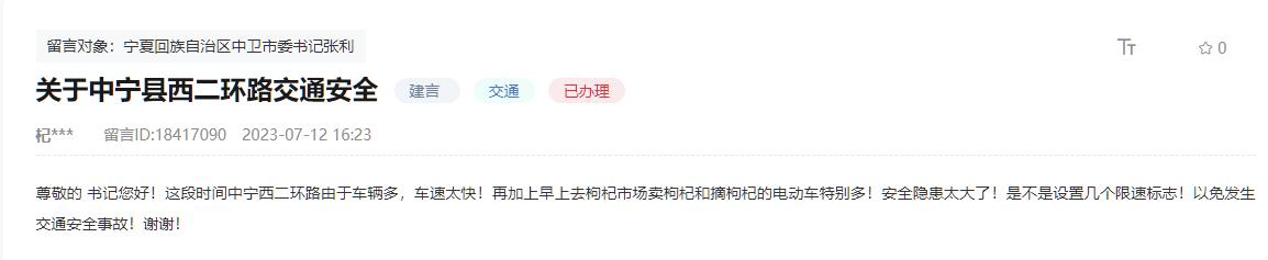 該網友表示,這段時間中寧西二環路由于車輛多,車速太快,再加上早上去枸杞市場賣枸杞和摘枸杞的電動車特別多,安全隱患太大了,希望設置幾個限速標志,以免發生交通安全事故。