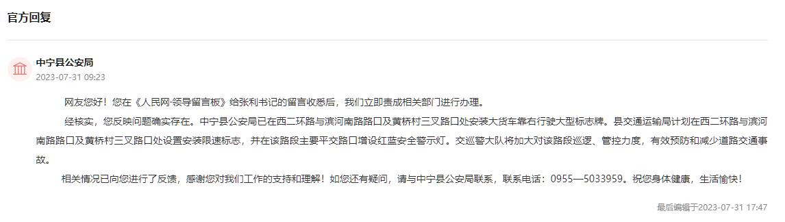 針對留言,中衛市立即責成相關部門進行辦理,目前,中寧縣公安局已在西二環路與濱河南路路口及黃橋村三叉路口處安裝大貨車靠右行駛大型標志牌??h交通運輸局計劃在西二環路與濱河南路路口及黃橋村三叉路口處設置安裝限速標志,并在該路段主要平交路口增設紅藍安全警示燈。交巡警大隊將加大對該路段巡邏、管控力度,有效預防和減少道路交通事故。