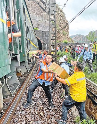 就在乘客被困雨中的同時,中國鐵路北京局及時組織力量,調度物資,開展救援。張家口車務段火速調配6000份面包、八寶粥等救援物資并組織裝車。7月31日晚8時56分,57402次物資運輸列車從張家口站始發開往沿河城站。然而,由于線路損毀嚴重,物資運輸列車只能抵達距離沿河城站8至9公里處,接下來的一段路,物資需要徒步搬運。