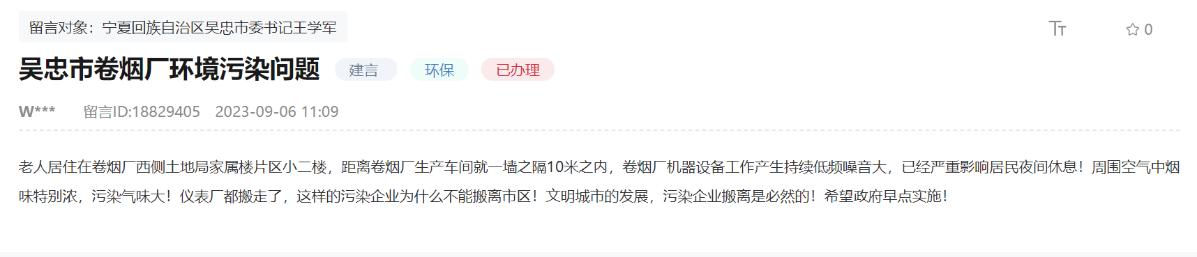 人民網銀川10月13日電(李甜甜)“家里老人居住在卷煙廠西側土地局家屬樓片區小二樓,距離卷煙廠生產車間就一墻之隔。卷煙廠機器設備工作時產生持續低頻,噪音大,已經嚴重影響居民夜間休息。同時,周圍空氣中煙味濃,污染氣味大?!苯?,一位寧夏網友通過人民網“領導留言板”留言,希望將吳忠卷煙廠搬離市區。