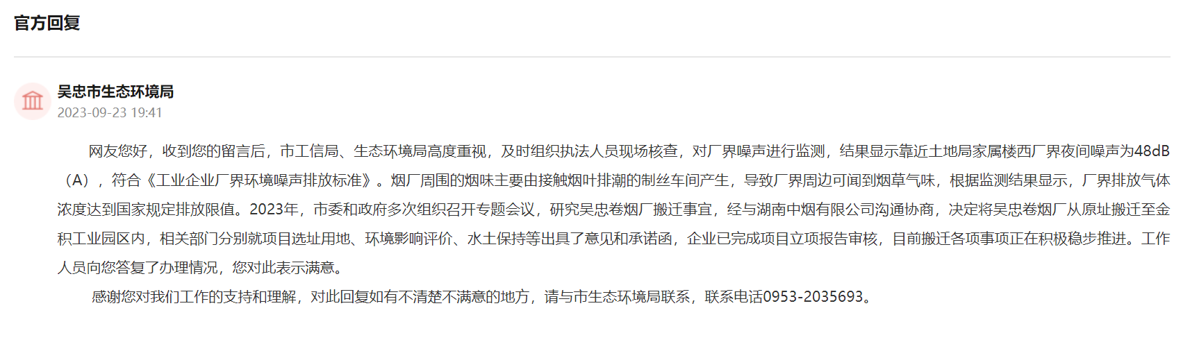 針對留言,吳忠市生態環境局回復稱,市工信局、生態環境局高度重視,及時組織執法人員現場核查,對廠界噪聲進行監測,結果顯示靠近土地局家屬樓西廠界夜間噪聲為48dB(A),符合《工業企業廠界環境噪聲排放標準》。煙廠周圍的煙味主要由接觸煙葉排潮的制絲車間產生,導致廠界周邊可聞到煙草氣味,根據監測結果顯示,廠界排放氣體濃度達到國家規定排放限值。