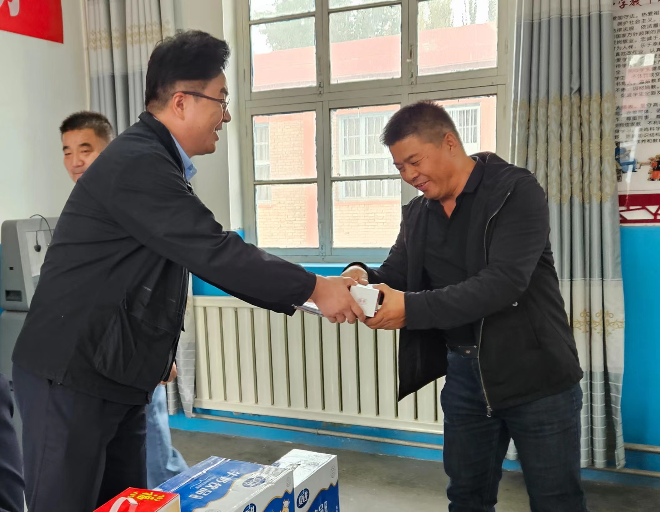 在活動現場,青年員工們詳細詢問孩子們的學習生活情況,傾聽他們的心聲,鼓勵孩子們要勇于面對困難,樹立良好的生活信心,保持積極向上的學習態度,用知識改變命運,爭做有理想的新時代好少年。青年員工為老師們送上筆記本和水杯,向老師們致以崇高的敬意,同時為他們普及金融知識以及提供后續金融服務。