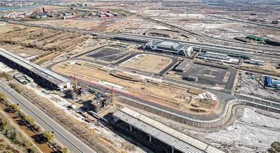 11月14日,從空中俯瞰正在建設的包銀高速鐵路石嘴山南站,“山”字造型的站房主體已具雛形。包銀高速鐵路銀川至惠農段長約101公里,預計2024年建成通車。記者 王曉龍 攝