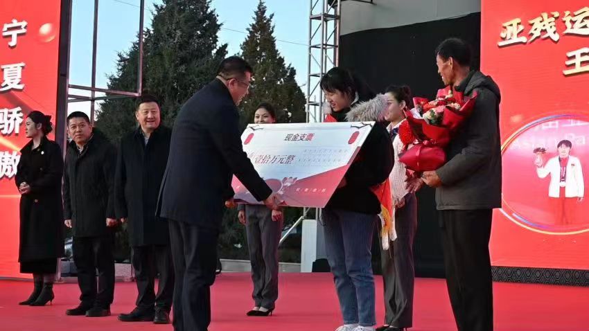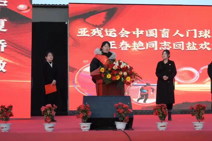 吳忠市政協副主席鹽池縣委書記王海寧向王春艷頒發了榮譽證書和獎金獎品。鹽池縣委常委組織部部長艾輝在致辭中向王春艷表示祝賀,并號召更多地殘疾人運動員勇往直前,永不止步,為鹽池的體育事業發展貢獻力量,為寧夏體育事業增光添彩。