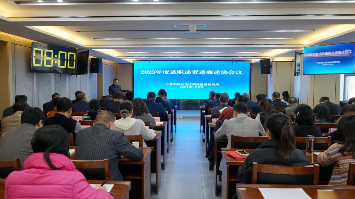 近日,寧夏回族自治區藥品監督管理局召開2023年度處級領導干部述職述責述廉述法會議,局黨組班子成員、藥品稽查專員、局機關全體干部、直屬事業單位班子成員參加會議。
