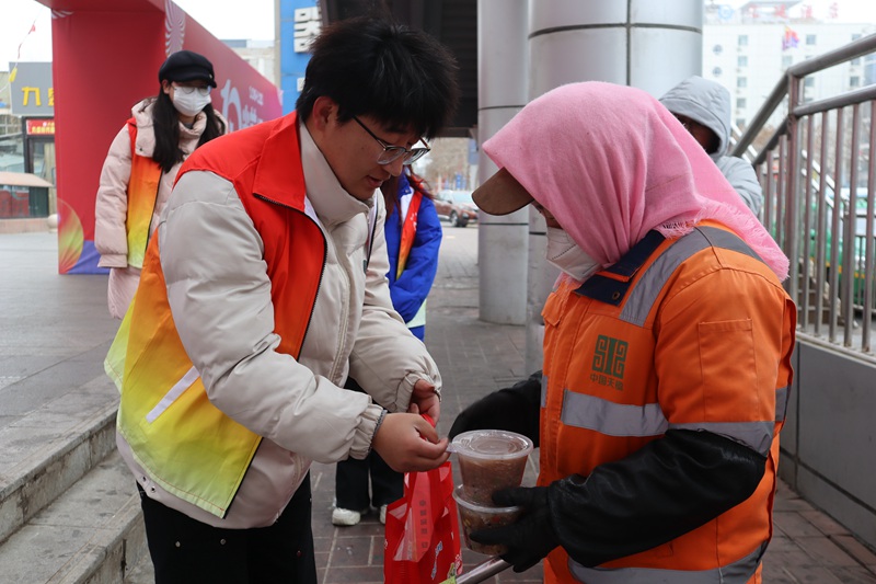 原州區新百大廈側門,志愿者為外賣小哥、公安干警等一線人員送上“臘八”暖心粥,同時送上了冬日的關心和溫暖。據了解,開展的“暖鍋暖心臘八粥”活動在六盤山機場、固原市火車站和火車站社區同步開展,在歡樂祥和中講好固原故事、倡導文明新風。