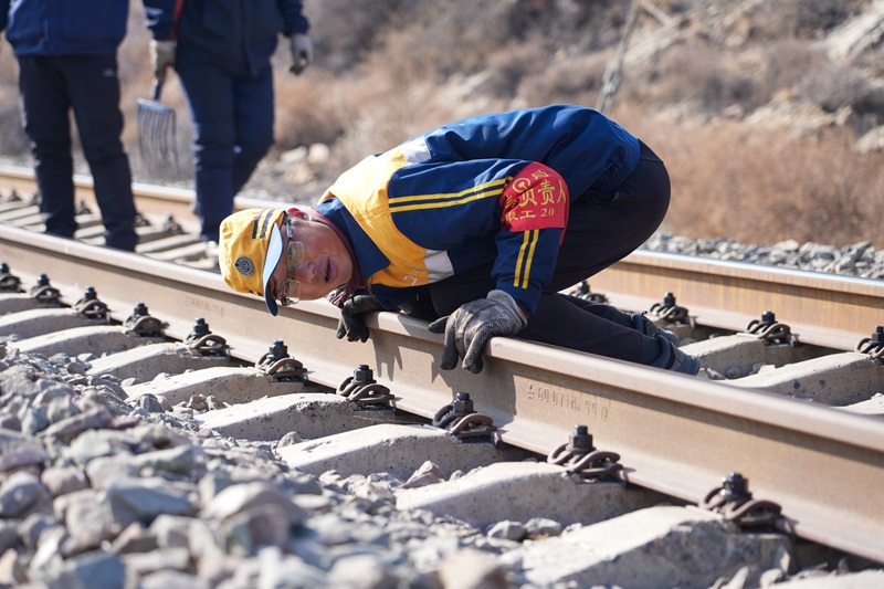 白芨溝工區工長張永剛正跪在鋼軌上目測鋼軌高低。束彥攝