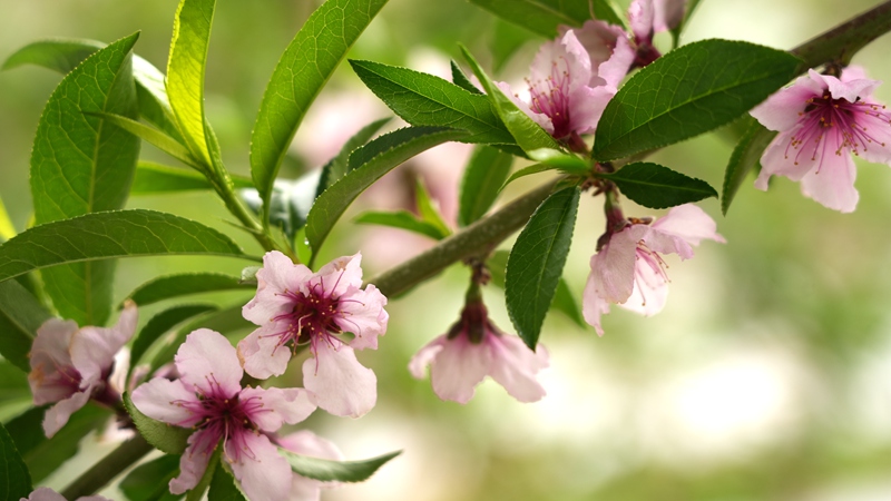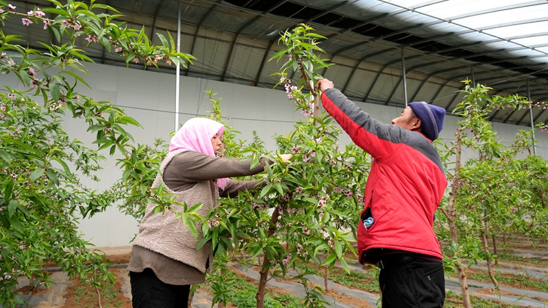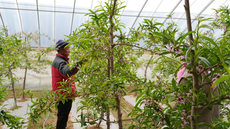 走進大棚,濃濃的暖意和花香撲面而來,放眼望去,桃花掛滿枝頭,嬌艷動人,在翠綠樹葉的映襯下顯得更加美麗,惹人喜愛。一只只蜜蜂在花間“翩翩起舞”,構成一幅清新、亮麗的“畫卷”。技術人員蘇月梅正在花海之間做好控旺工作,為今年的穩產增收打好基礎。