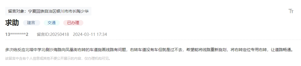 人民網銀川3月21日電(李甜甜)“北塔中學北側沙海路向鳳凰街右轉的車道施劃線路有問題,右轉車道沒有車但就是過不去?!苯?,寧夏一網友在人民網“領導留言板”上建議,希望能將線路重新施劃,重新施劃道路指引標志,將右轉定位專用右轉,使道路暢通。