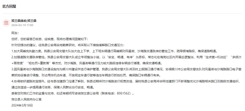 針對該留言,銀川市賀蘭縣政府給出回復:經賀蘭縣公安局實地勘察研究,將采取以下措施緩解路口交通壓力:加大高峰崗執勤力度,賀蘭縣公安局交警大隊加大在上下學、上下班車輛通行高峰期對鳳凰街、沙海路交通秩序的管控工作,疏導擁堵路段,確保道路暢通;加強道路交通秩序管控,賀蘭縣公安局交警大隊成立專項整治小組,以“安全、暢通、有序”為目標,常態化在海亮社區內開展巡邏整治,利用“定點查+機動巡”“多頻次+高密度”“輕處罰+重教育”等方式,對沙海路、鳳凰街等通行壓力較大路段違停車輛進行清理,確保交通暢通。