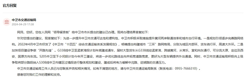 針對此留言,中衛市交通運輸局答復如下:為進一步提升中衛市交通可達性和便利性,中衛市積極采取措施提升黃河兩岸聯通效率和城市出行環境。一是規劃引領逐步完善路網結構。2022年4月中衛市印發了《中衛市“十四五”綜合交通運輸體系發展規劃》,明確提出構建城市“三環”路網格局,分別為城區內部環、貨車繞行環、高速大外環。二是加快項目建設爭做“開路先鋒”。G338線中衛至孟家灣段計劃年底建成通車,屆時大型貨車從G338線經孟家灣,跨越黃河,從常樂、宣和向東通行,可分流太原、定邊及西安、固原方向車流。S205中衛至下小河段計劃今年開工建設,將進一步優化路線走向并拓寬道路寬度,更好為大型車輛提供外出通道。同時,中衛市交通運輸局積極向上級爭取將部分路段納入S308線中衛市轄區過境段進行整體規劃和建設,建成后將有力緩解中溝路、迎湖路的交通壓力。