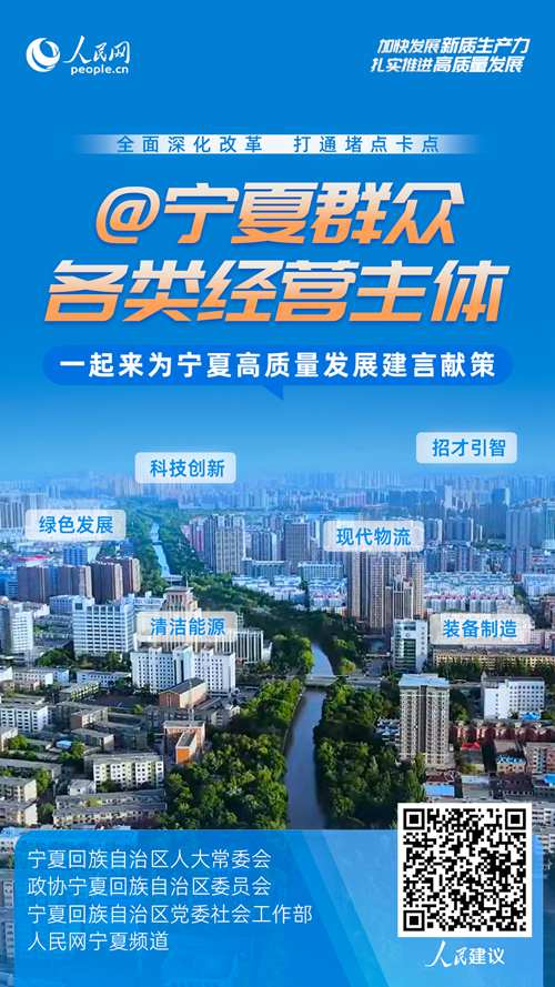 向“新”而行、以“質”致遠,即日起,人民網寧夏頻道聯合寧夏回族自治區人大常委會、政協寧夏回族自治區委員會、寧夏回族自治區黨委社會工作部,面向寧夏廣大群眾和經營主體推出“加快發展新質生產力 扎實推進高質量發展”意見建議有獎征集活動,邀請廣大網友和經營主體通過人民網“領導留言板”小程序、“人民網+”客戶端等渠道,為家鄉發展建言獻策。